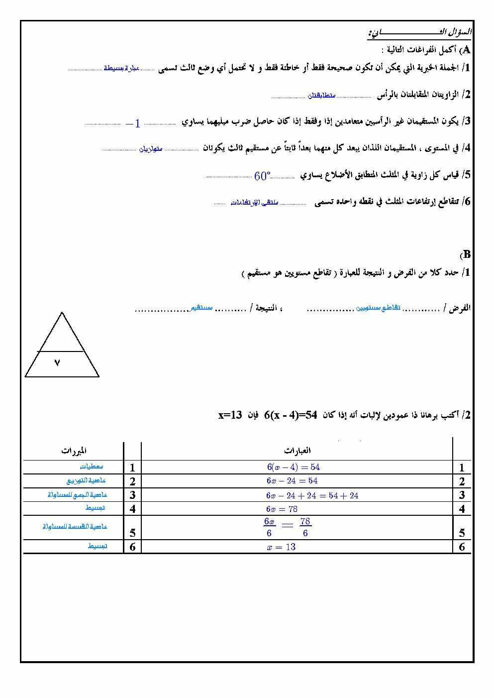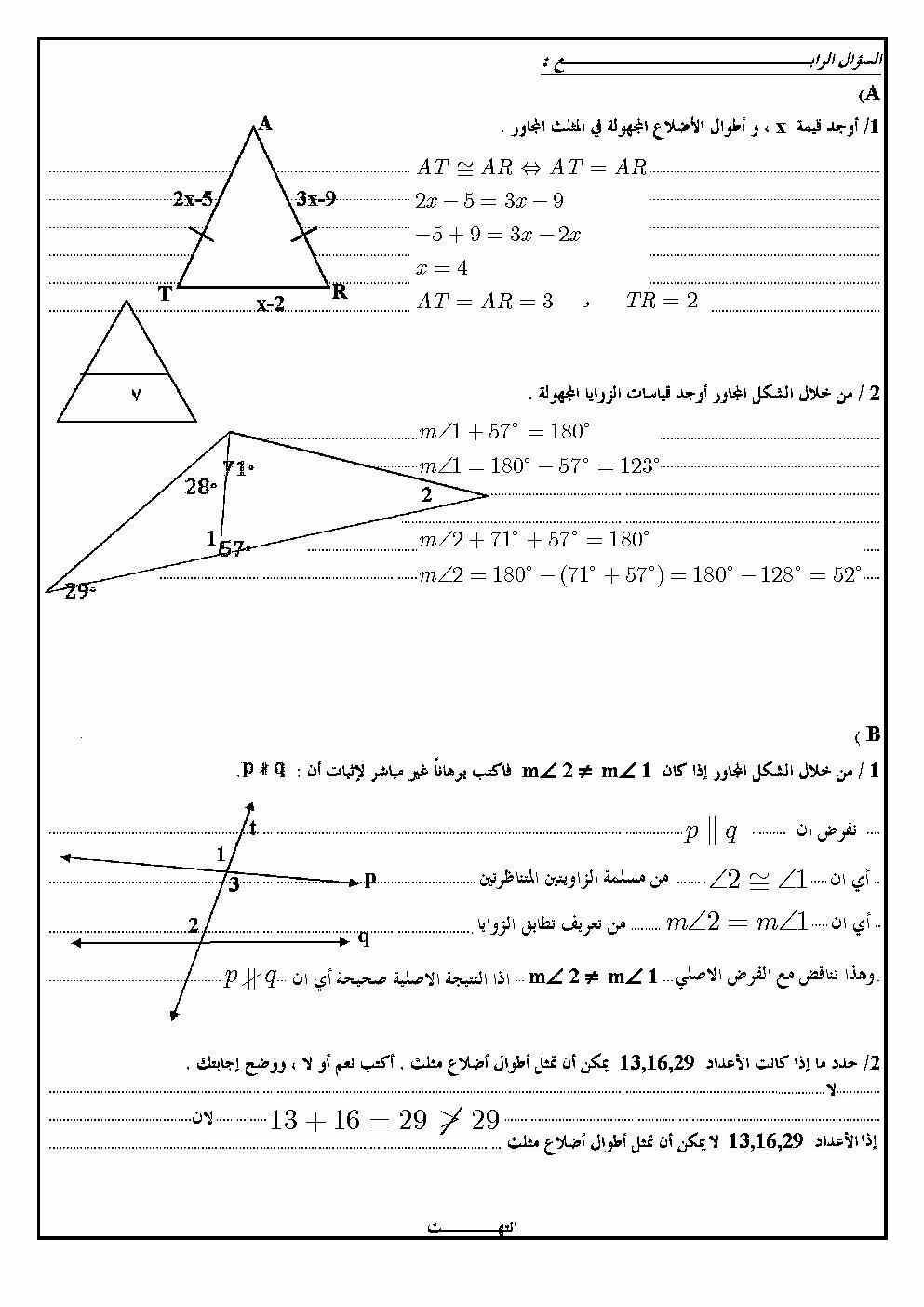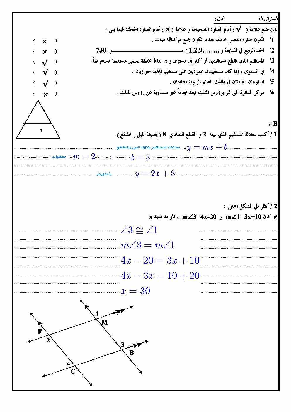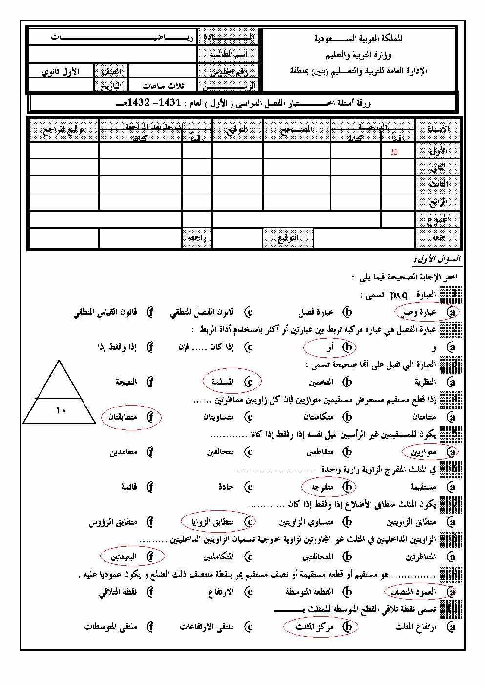 اختبار نهائي مادة الرياضيات أول ثانوي المستوى الأول الفصل الدراسي الأول عام 1432هـ بنين