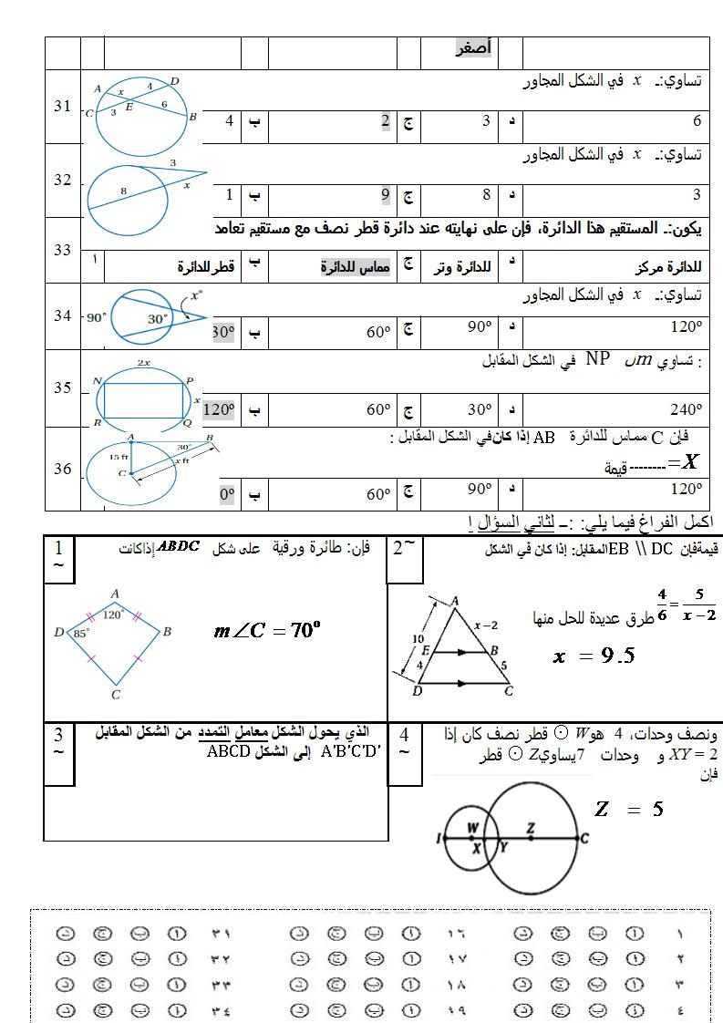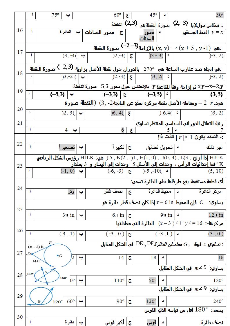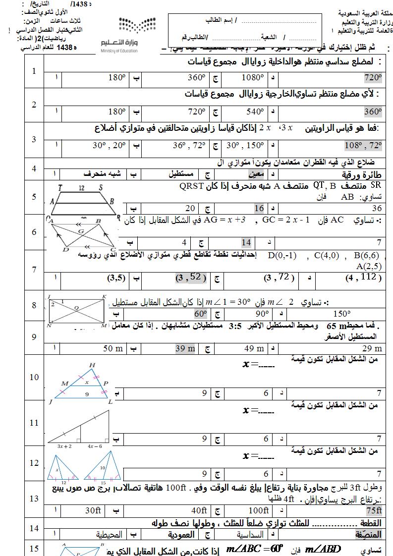 اسئلة اختبار مادة الرياضيات 2 الصف الأول ثانوي نظام مقررات الفصل الأول 1438هـ