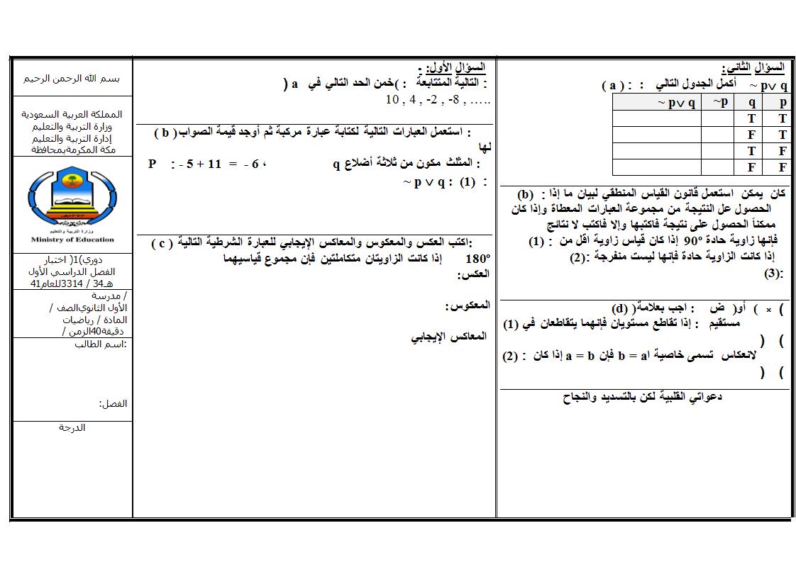 الاختبار الدوري الأول لمادة الرياضيات أول ثانوي المستوى الأول 1434هـ